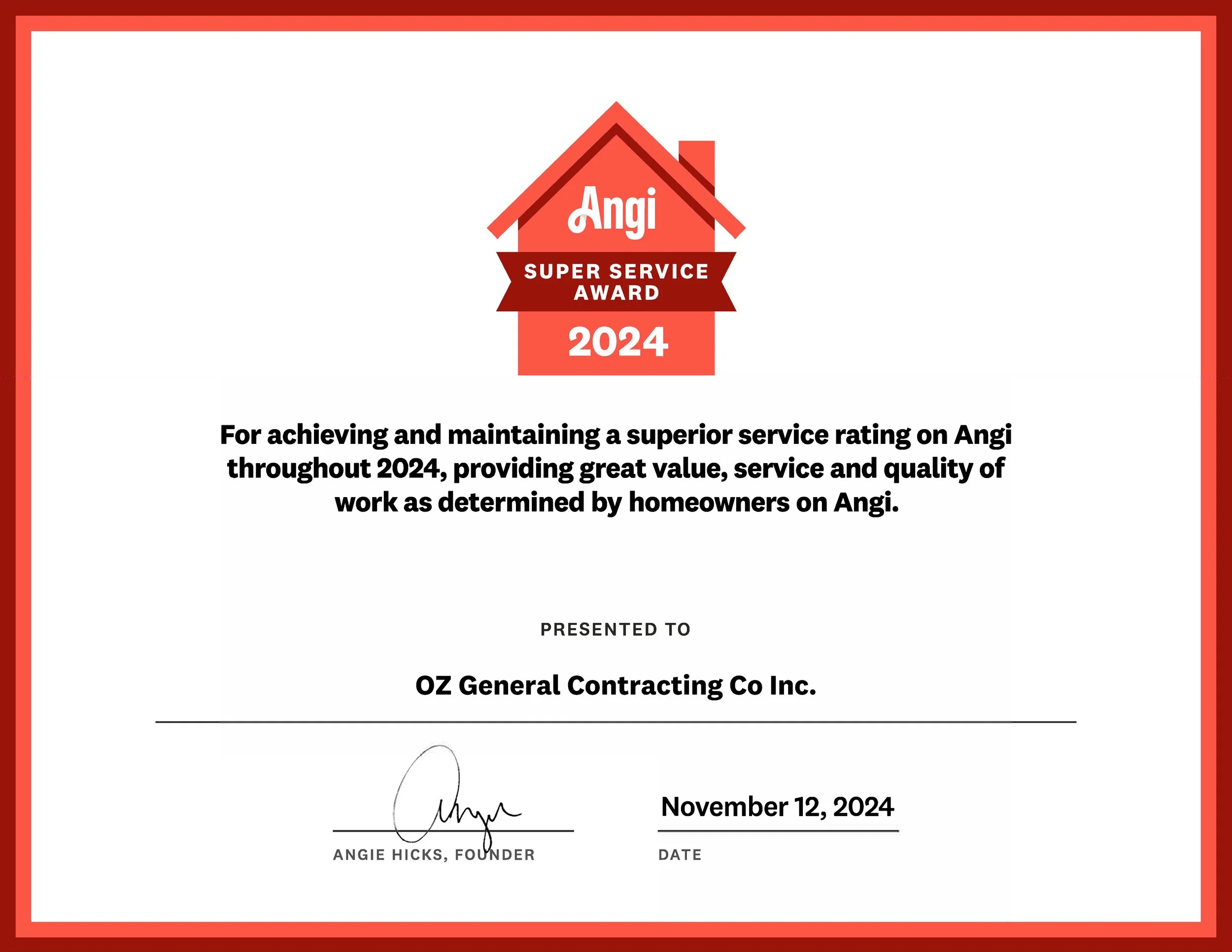OZ General Contracting Co Inc. is a proud recipient of the 2024 "Angie's List Super Service Award" for the 13th consecutive year. We are extremely honored by this distinctive accomplishment because only about 5% of companies on Angie's List have the privilege of receiving this award!